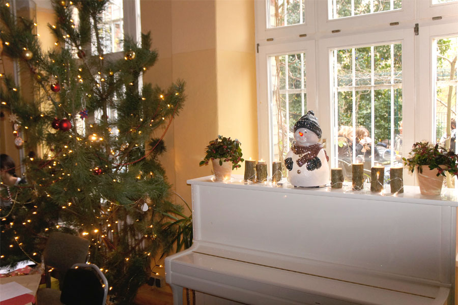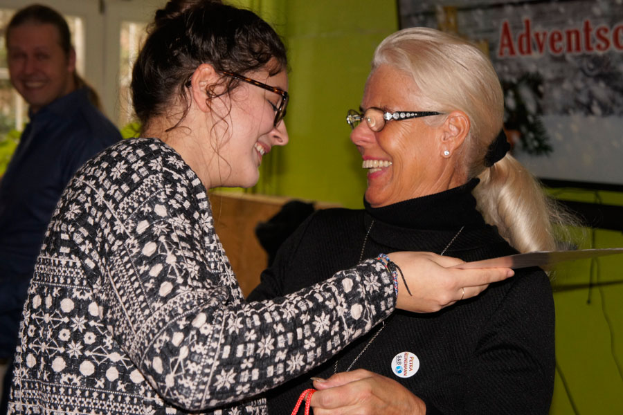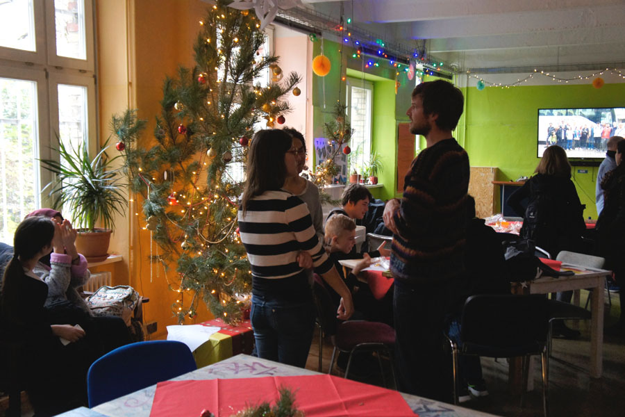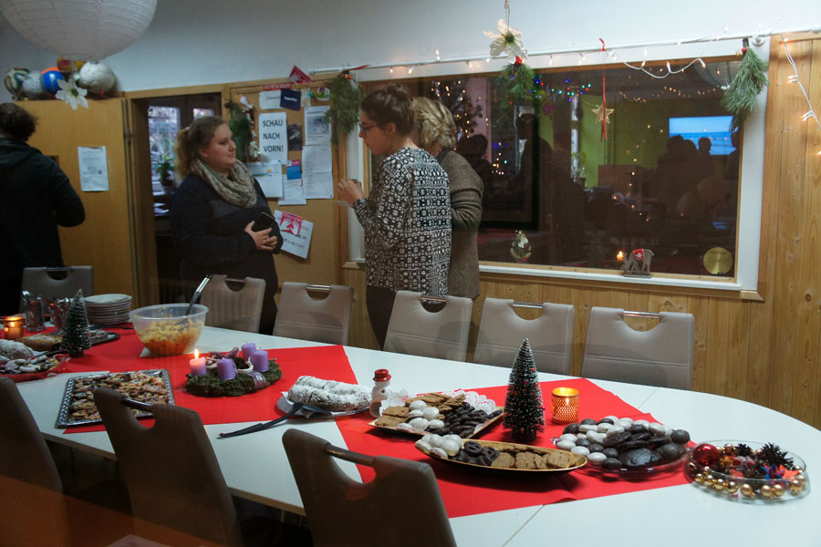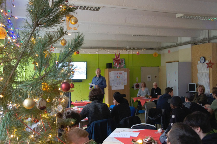 Ein letzter Höhepunkt im Jahr ist bei Schule & Beruf immer die Zeugnisvergabe sowie die Verleihung von Projektengeln an Jugendliche für besondere Mitarbeit und Kompetenzen, die in diesem Jahr wieder im Rah­men eines Adventscafés stattfand. Der Gruppenraum war festlich geschmückt und mit dem am letzten Kreativtag des Jahres gebastelten Weihnachtsschmuck dekoriert. Einen Weihnachtsbaum hatten wir - wie schon im Vorjahr - aus dem von uns bewirtschafteten Waldstück aus dem Oberkrämer Forst mitge­bracht.Nach der Begrüßung aller Gäste begann die Veranstaltung mit einem gemeinsam gesungenen Weihnachts­lied und einer von Patrick am Klavier begleiteten Weihnachtsgeschichte (Das Geschenk der Weisen). Es folgte die von vielen mit Spannung erwartete Zeugnisvergabe und allen Prüflingen wurden dabei von Petra kleine Weihnachtsgeschenke übereicht.Im Anschluss an den offiziellen Teil kam es dann bei Kaffee, Kuchen und selbstgebackenen Keksen in weih­nachtlicher Atmosphäre zu zahlreichen kurzweiligen Gesprächen zwischen Eltern, BetreuerInnen, Teilneh­merInnen und MitarbeiterInnen. Im Hintergrund lief auf dem Fernseher ein musikalisch untermalter Foto­rückblick der Veranstaltungen des zuendegehenden Jahres, der die vielfältigen Aktivitäten von Schule & Beruf noch einmal in Erinnerung rief.