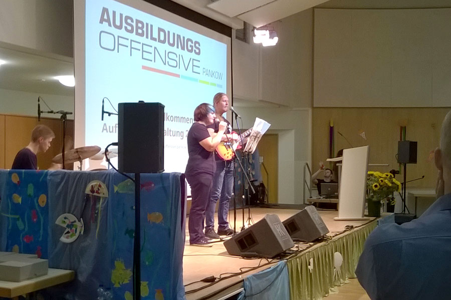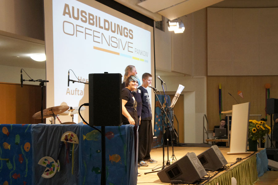 Am 15. September spielte unsere Schulband Bandprojekt „Völlig anders“ auf der Auftaktveranstaltung der Ausbildungsoffensive Pankow. Es wurden bekannte wie auch eigene Musikstücke gespielt. Die Teilnehmer des Bandprojekts hatten zuvor zwar schon auf den Festen von Schule & Beruf Auftritte, so war dies aber eine noch größere Überwindung, da das Publikum diesmal um einiges größer und nicht in so einem privaten Rahmen sein sollte.Nach dem Aufbau der Instrumente und dem Soundcheck wurde noch einmal geübt. Der eigentliche Auftritt verlief somit reibungslos und hat der Band sowie dem Publikum viel Freude bereitet. Auf der Veranstaltung selber wurden noch andere Projekte vorgestellt, Preise und Auszeichnungen verliehen, man konnte sich austauschen und unterhalten und zum Schluss gab es dann noch ein Buffet.Alles in allem war die Veranstaltung eine gute Erfahrung sowohl für die Teilnehmer als auch die Bildungsbegleiter, so dass die Jugendlichen in ihrem Selbstbewusstsein und Auftreten gestärkt und alle mit einem guten Gefühl von der Bühne gingen.
