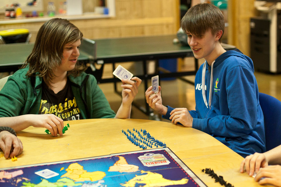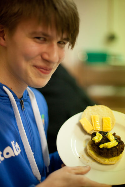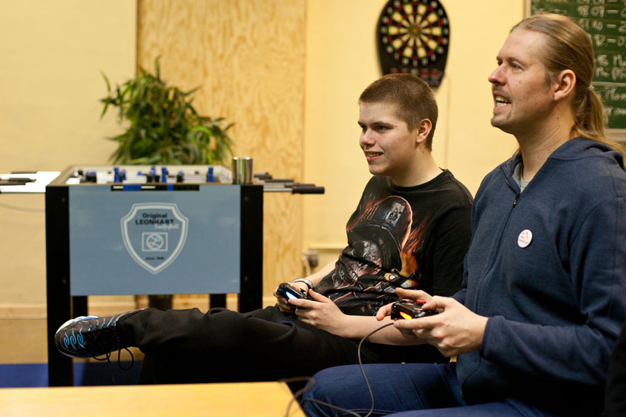 Am 22. Januar fand bei uns ein Übernachtungsabend statt mit diversen Aktivitäten im sportlichen, musikalischen und kulinarischen Bereich. Doch auch im Vorfeld standen viele Arbeiten auf dem Plan: Das Küchenteam hatte an diesem Donnerstagmorgen besonders viel zu schleppen und vorzubereiten, denn neben dem obligatorischen Mittagessen gab es am Abend leckere selbstzubereitete Burger, natürlich auch als Gemüseburger.Eigentlich sollten ja alle um 22 Uhr im Bett sein. Aber bei dem großen Angebot an Aktivitäten war dies einfach nicht möglich. Das Dartspielen musste sogar auf 5 Uhr morgens verlegt werden...Ein besonderes Highlight war, dass sich Numcy an die PS4 zwingen ließ und am FIFA 15 Fußball-Tournier teilnahm (erst unter Protest, dann mit großer Begeisterung, doch die Niederlage war unvermeidbar und verdient (Anmerkung der Redaktion)). Doch auch alle anderen Mitspieler hatten viel Spaß, so dass diese Aktivität bis in die frühen Morgenstunden anhielt.Wer nicht so Fußballbegeistert ist, hatte in der oberen Etage die Alternative bei lauter Musik zu tanzen oder später in gemütlicher Runde den Film „Kick Ass“ zu sehen.Wenn die virtuellen Fußballer eine Pause einlegten, fanden sich vor allem die Mädchen zum Singstar spielen ein.Gegen Mitternacht fand sich die Band „Völlig anders“ noch zu einer außerordentlichen Probe im Bandraum ein. Hinterher waren sich alle Beteiligten einig, dass sie häufiger zu dieser Zeit proben sollten. Zur Überraschung der Band waren sie in dieser Nacht nicht die einzigen in der Remise: Ein munteres Grüppchen hatte sich zum mitternächtlichen Krafttraining eingefunden. Dabei stellte sich heraus, dass hochhackige Schuhe nicht zum Training geeignet sind.Am nächsten Morgen sah man dann die „ungeschminkte Wahrheit“: nach der langen Nacht, die teilweise erst um 6 Uhr nach guten Gesprächen und einem Dart-Tournier endete, wurden alle um 9 Uhr zum Frühsport geweckt. Komischerweise haben sich aber alle geweigert. Dennoch blieb vor dem Frühstück keine Zeit mehr für Schminktipps!Nach Brunch und Projektreinigung konnten wir ab 11 Uhr nach Hause gehen, um den entgangenen Schlaf nachzuholen.Insgesamt ein erfolgreicher Abend, bei dem sich alle besser kennenlernen konnten und sehr viel Spaß miteinander hatten.