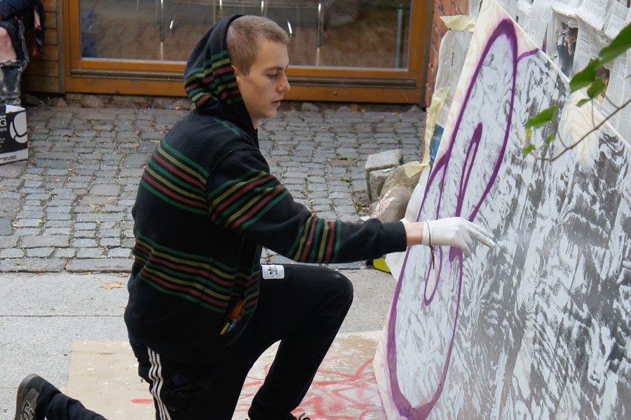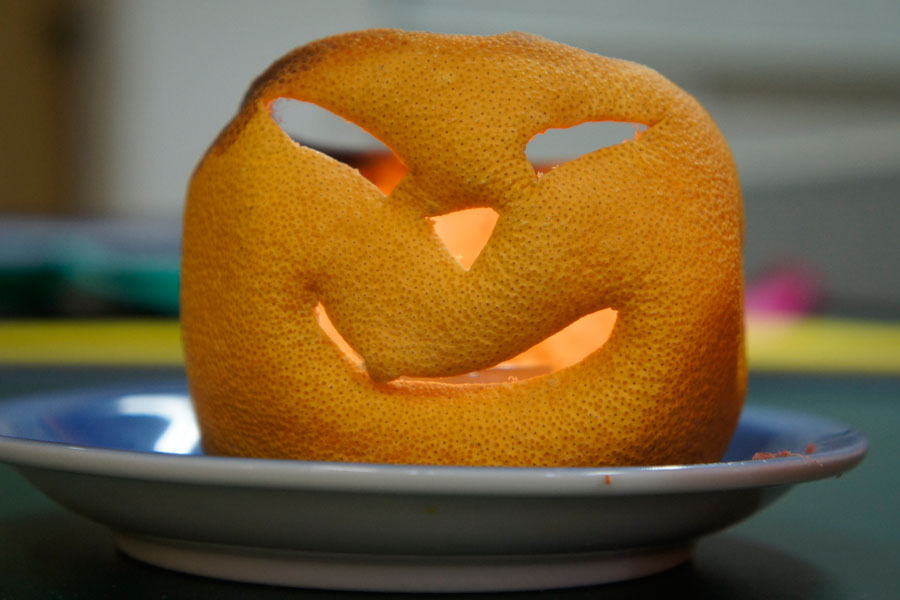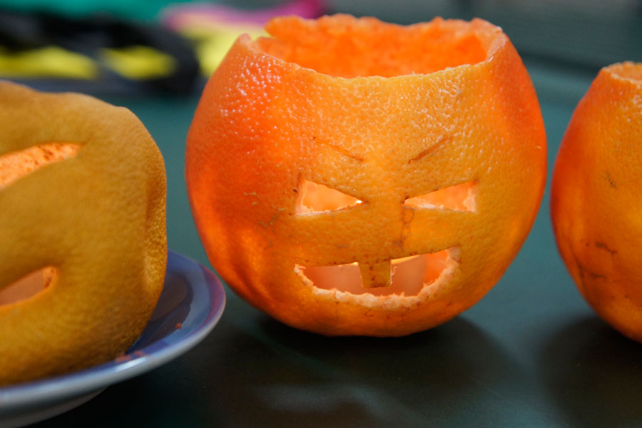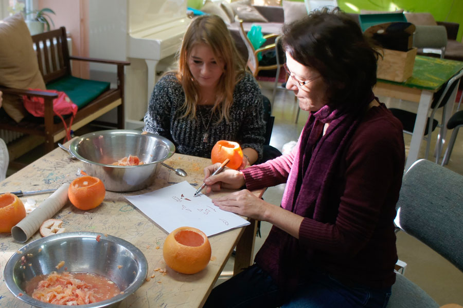 Am 14. Oktober fand wieder einer unserer monatlichen Kreativtage statt. Er stand diesmal im Zeichen des Herbstes und der damit verbundenen inzwischen eingebürgerten Tradition des Halloween-Festes. Neben den geschnitzten Kürbissen entstanden auch viele kleine Tischlampen aus Zitrusfrüchten, die dem Original jedoch zum Verwechseln ähnlich sehen und für hervorragenden Saft sorgen.Wer sich nicht für Schnitzereien begeistern konnte, hatte die Möglichkeit allerlei kuriose Figuren aus Sauerteig zu formen oder in der Küche aus Lebensmitteln gruselige Dinge zu basteln wie die für Halloween typischen „kalten Finger“. Auch Dekoration und Gestaltung in herbstlichem Stil waren Teil dieses Tages.Ein weiteres Highlight der Gestaltungsmöglichkeiten bot sich beim Graffiti-Workshop. Hier konnten die Teilnehmer eine große Fläche mit Spraydosen gestalten und ihren kreativen Ideen freien Lauf lassen.