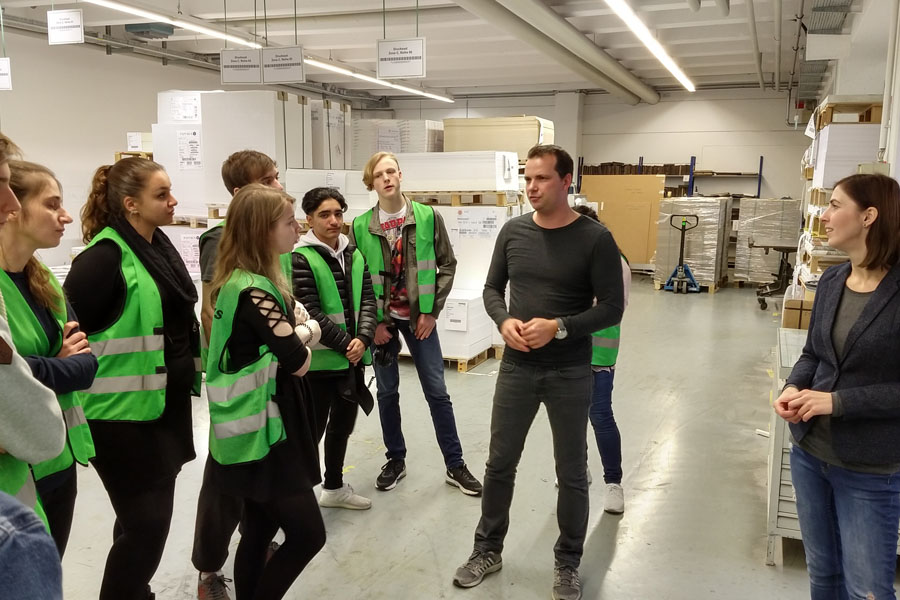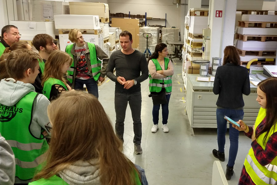 Am 12.11.2018 hatten wir eine Betriebsbesichtigung im Druckhaus Berlin-Mitte. Das Druckhaus Berlin-Mitte ist ein traditionsreiches Unternehmen, das heute großen Wert legt auf umweltschonende Druckproduktion.Nach einer kleinen Schulung über den Betriebsablauf sowie Verhalten in den Produktionsräumen und in der Nähe der Maschinen durften wir in die Produktionsräume.Es wurde uns der Produktionsablauf vorgestellt im Offsetdruck, Digitaldruck und die Möglichkeiten der Veredelung der Druckerzeugnisse.Im Druckhaus Berlin-Mitte können Schüler sich im Praktikum erproben, um so einen Einblick in den alltäglichen Betriebsablauf der Druckerei zu erlangen. Studenten haben die Möglichkeit in Druck- und Medientechnologie Praxissemester zu absolvieren.Ausbildungsmöglichkeiten sind gegeben in den Bereichen Medientechnologe/in Druck, Medientechnologe/in Druckverarbeitung und Mediengestalter/in Digital und Print.Ganz herzlich möchten wir uns bei Frau Lieke bedanken, die uns an diesem Tag im Druckhaus Berlin-Mitte betreut hat.