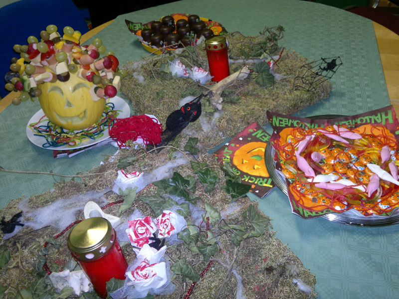 Am letzten Donnerstag haben wir Halloween gefeiert und wir hatten eine Menge Spaß. Es gab grüne Bowle mit Händen, ein Gehirn aus Blumenkohl und andere schaurig leckere Sachen. Einige hatten sich sogar verkleidet und kamen als Zombie, Rockerbraut oder Hexe. Neben Tischtennis und Kicker wurden auch Brettspiele gespielt, vor allem Risiko und Schach waren sehr beliebt. Im Anschluss guckten wir noch einen Gruselfilm, der eigentlich gar nicht so gruselig war, denn als der Film vorbei war, schliefen schon die meisten. Gegen acht Uhr morgens wurden wir dann von den anderen TeilnehmerInnen zum gemeinsamen Frühstück geweckt. Es war eine schöne, gruselige Nacht.Fotos von den Vorbereitungen zur Party: