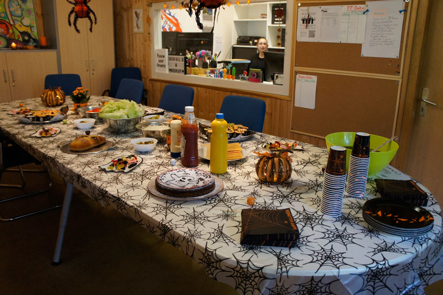 Zum 31. Oktober lud Schule & Beruf seine Teilnehmer*innen und Mitarbeiter*innen zur jährlichen Halloweenparty ein. Vorbereitet und durchgeführt wurde die Feier größtenteils von einigen unserer jungen Menschen, die sich dafür eigenständig eingesetzt haben. Die Rückmeldungen der Anwesenden waren überwältigend positiv.Medo: Eine Teilnehmerin sagte: Viele Partygäste freuten sich am meisten über das Essen sowie über Singen und Tanzen vor Publikum. Für das leibliche Wohl wurde unter anderem mit Muffins, Salaten, Kuchen, Götterspeise, frisch gegrillten Hamburgern und Gemüseburgern gesorgt.
