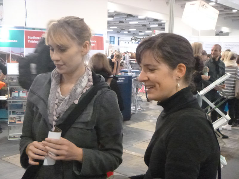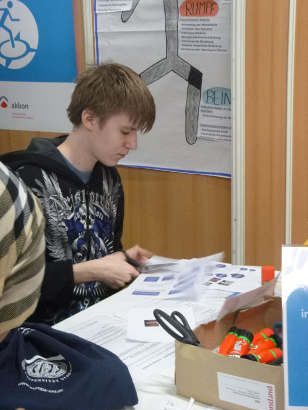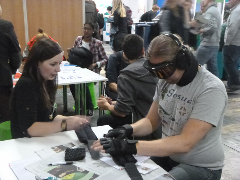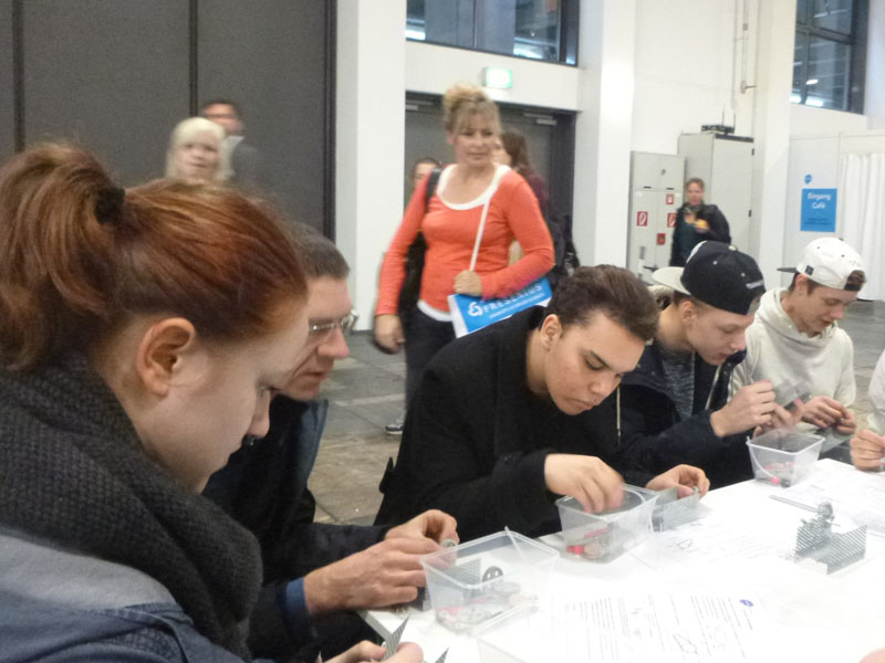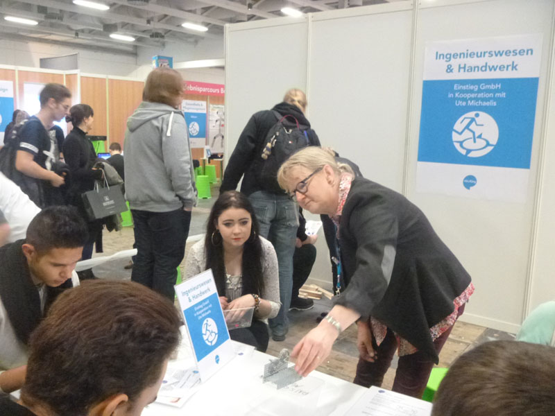 Wir nutzten am 14.11. die Gelegenheit, die Ausbildungsmesse Einstieg in den Messehallen des ICC zu besuchen. Viele Betriebe und Unternehmen stellten sich vor und beantworteten trotz des großen Andranges geduldig unsere Fragen zu den Ausbildungsberufen. Daneben waren auch einige Universitäten, Vertreter der berufsvorbereitenden Jahre und Bewerbungsprofis vor Ort.Mit Notizmaterialien und Informationsaufträgen ausgestattet erkundeten wir die riesige Messehalle mit den Ausstellern der verschiedenen Unternehmen. Die BSR, die DB und die Bundes- und Landespolizei sind nur einige der großen Arbeitgeber, die auf der Suche nach Auszubildenden mit Schulabschlüssen und geeigneten Voraussetzungen sind. In der Vorbereitung des Ausflugs haben wir Interessenstests durchgeführt, so dass wir mit allen Bildungsbegleitern viele kleine Gruppen bilden konnten, die Berufsfeldern entsprachen. Nach einer kurzen Mittagspause hatten wir noch das Glück, am eigentlich ausgebuchten Erlebnisparcour teilnehmen zu können. Hier konnten wir an verschiedenen Stationen typische und praktische Tätigkeiten von Berufen kennenlernen. Von metall- und holztechnischen Konstruktionen wie etwa dem verkleinerten Nachbau eines Kettenzuggetriebes über kreative Berufe bis hin zur praktischen Vorstellung des Alltagsgefühls von älteren Menschen reichten die einzelnen Erlebnisstationen. Die knifflige Getriebekonstruktion erforderte einigen Sachverstand und viel Fingerspitzengefühl. Um Nachvollziehen zu können, wie das Körper- und Wahrnehmungsgefühl von älteren Menschen ist, wurden einige von uns in den gesteckt und mit Alltagsaufgaben betraut. Um einen Pflegeberuf zu erlernen, muss man sich das vorstellen können.Durch den Besuch der Messe konnten einige von uns ihre näheren Zukunftsvorstellungen konkreter werden lassen, haben interessante Anregungen oder zumindest ein, zwei Kugelschreiber mit nach Hause nehmen können.