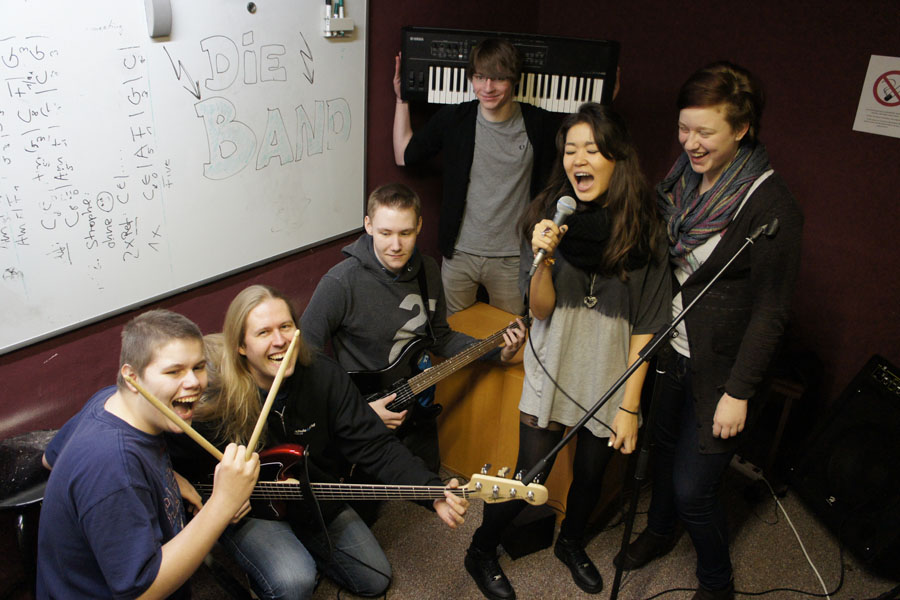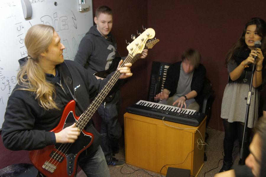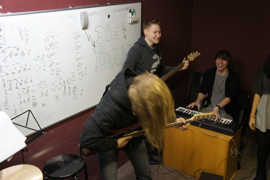 Musik ist wahrscheinlich die einzige Sprache, die überall und von jedem verstanden wird. Darum ist es auch bei uns sehr wichtig, diese „Weltsprache“ zu fördern und zu verbreiten.In der Praxis funktioniert das so: Am Montag Nachmittag ab 15 Uhr findet Gitarrenunterricht statt. Die so erworbenen Kenntnisse können dann am Dienstag gleich in der Projektband eingesetzt werden. Fast jede Woche können alle Musikinteressierten hier ihren musikalischen Beitrag leisten.Neben den Fähigkeiten kommt es beim Proben aber natürlich ganz besonders auf den Spaß an, wie man anhand der Fotos vom letzten Dienstag sieht: