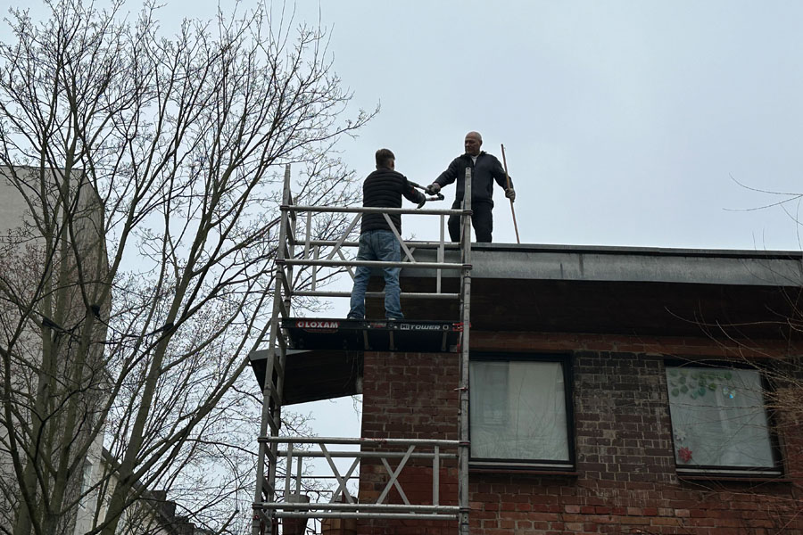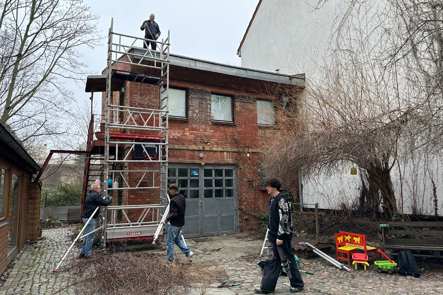 Neben den regelmäßigen Reinigungsarbeiten müssen hin und wieder auch mal kleinere Arbeiten zur Erhaltung der von uns genutzten Gebäude durchgeführt werden: An der Wand der Remise im Hinterhof der Wriezener Straße 38 hat sich der sogenannte wilde Wein (Jungfernrebe) in den letzten Jahren stark ausgebreitet und ist teilweise bis auf das Dach gewachsen. Um Schäden am Dach zu vermeiden, mussten diese Triebe zurückgeschnitten werden.Damit der Rückschnitt keine Vögel beim Nestbau oder gar Brüten gefährdet, haben wir heute das trockenen Winterwetter genutzt, um die noch blattlosen großen Haupttriebe zu entfernen. Michael hat ein Rollgerüst gemietet, mit dem wir bis über die Dachkante die Möglichkeit hatten, die Ranken zu entfernen. Beim Aufbau und den Arbeiten an der Hauswand halfen auch 2 Teilnehmer mit, die dadurch praxisnah einen Einblick in den Beruf des Gerüstbauers gewinnen konnten. Gemeinsam dauerte es nicht lange, bis Wand und Dach von dem Bewuchs befreit waren und auch das Zerkleinern der Weinreben war schnell erledigt. So kannte das Gerüst bereits vor der Mittagspause wieder abgebaut und zur Gerüstvermietung zurückgebracht werden.