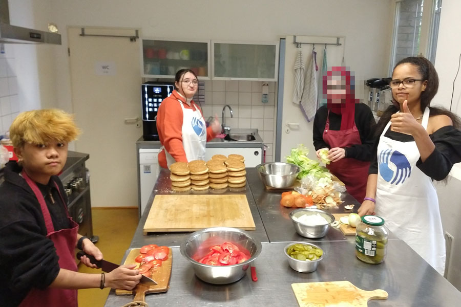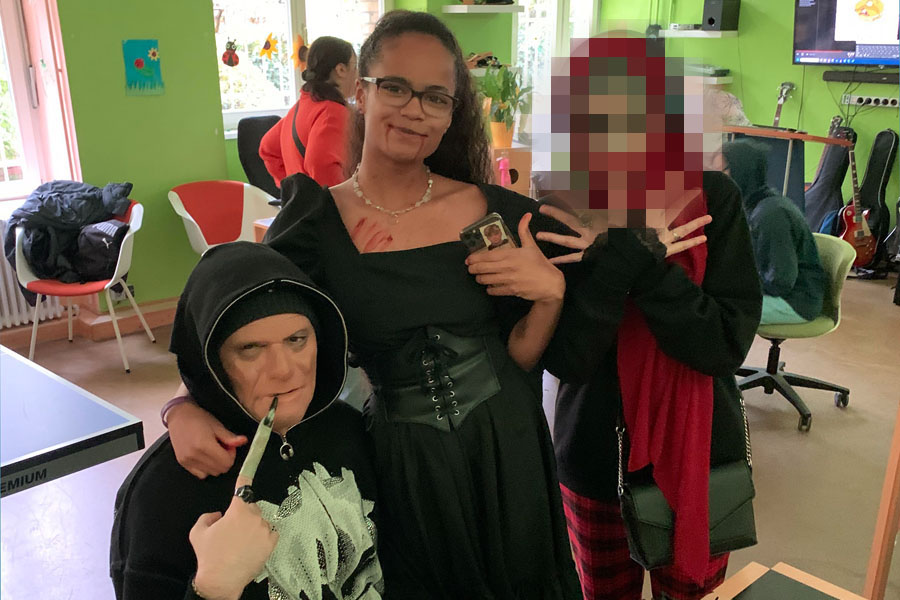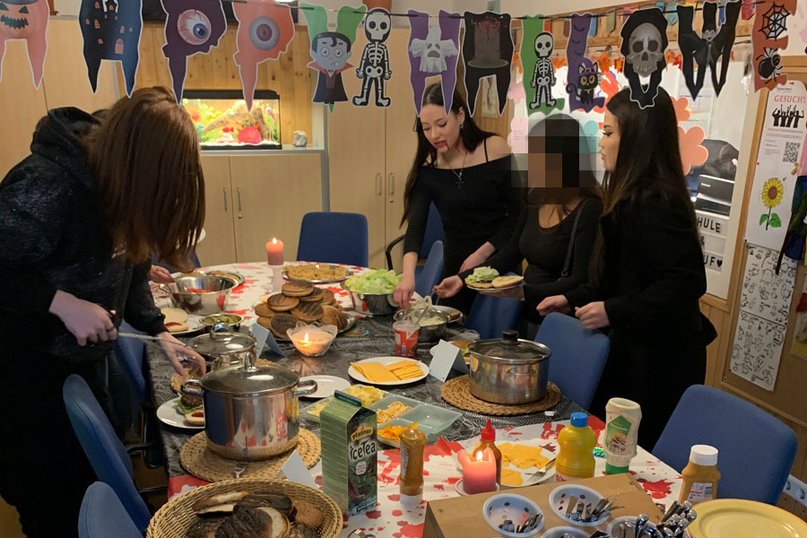 Am Montag, dem 30.10.2023 haben wir unsere Halloween-Party vorbereitet. Wir haben uns in drei verschiedene Gruppen aufgeteilt, eine von diesen hat das Einkaufen übernommen, eine andere hat dekoriert, und die letzte hat einen Apfelkuchen gebacken. (Sandra)Am Dienstag, dem 31.10.2023 war der Tag der eigentlichen Feier. Viele von uns Teilnehmer:innen sind schon verkleidet erschienen, der Raum war vorbereitet mit gedimmten Lichtern, Musik hatte gespielt, und Snacks standen überall auf den Tischen bereit. Nach einiger Zeit wurde angefangen, den Grill vorzubereiten und die Brötchen zu rösten. Als das erledigt war, gab es Mittagessen, welches aus Dino-Nuggets, Burgern und sonstigem bestand. Wer wollte, konnte sich auch vor Ort schminken lassen. Selbst unsere Bildungsbegleiter haben sich daran beteiligt. Am Nachmittag, ab 15:00 neigte sich die Feier dann dem Ende zu. Es war ein ereignisvoller Tag, und wir alle hatten unseren Spaß gehabt.