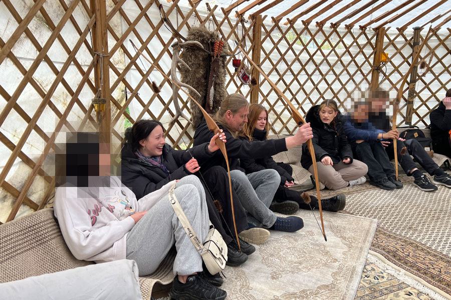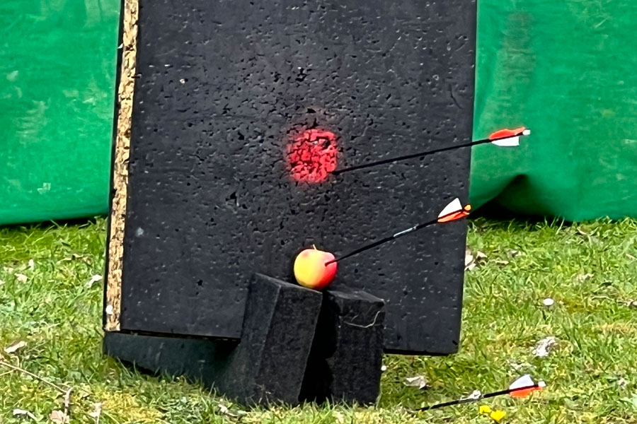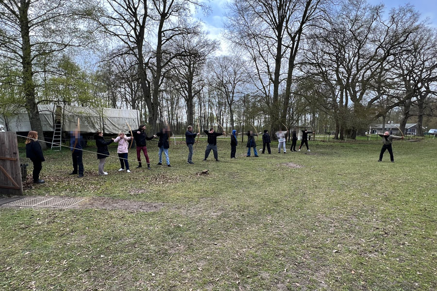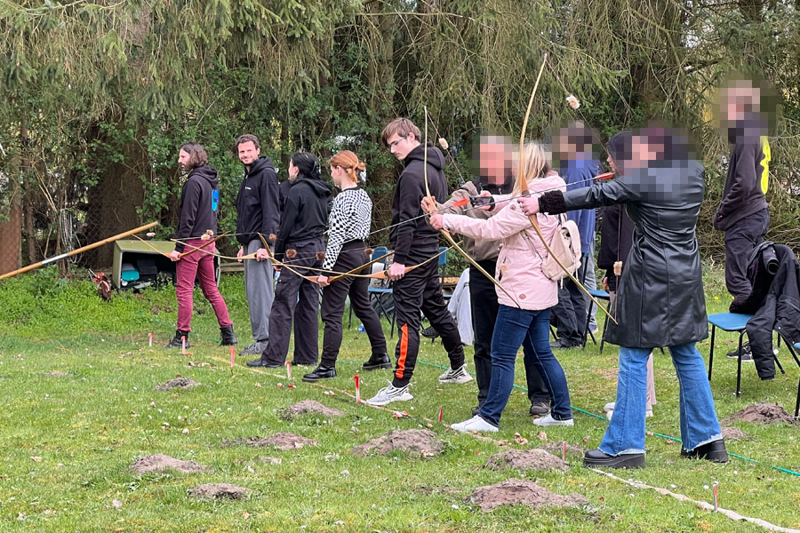 Als sich die Gruppen wieder trafen, überraschten uns die Betreuer mit der Aktivität Bogenschießen. Nach einer Stunde Probetraining durften wir selbst den Bogen in die Hand nehmen. Es war eine interessante Erfahrung, die aber leider für die Teilnehmer:innen etwas zu lange dauerte und einige von uns haben den einen oder anderen blauen Fleck mit nach Hause genommen. Trotzdem haben wir bei einigen Teilnehmer:innen unentdeckte Fähigkeiten festgestellt, gerade als es darum ging, einen Apfel aus der Entfernung zu durchbohren.