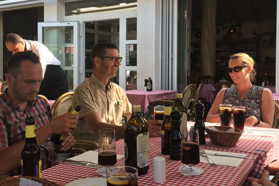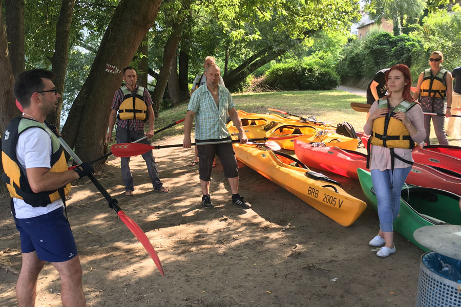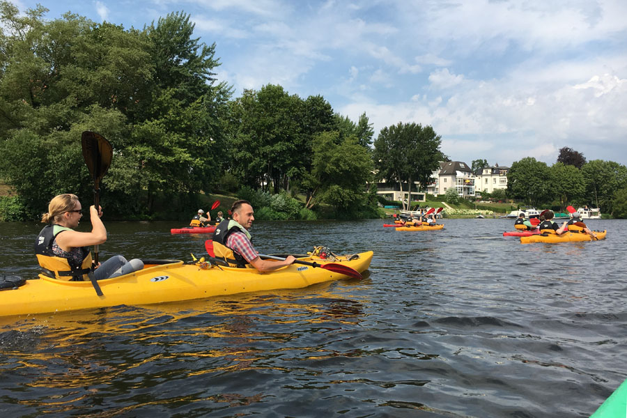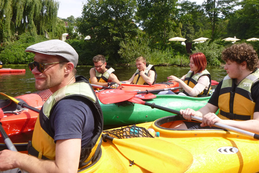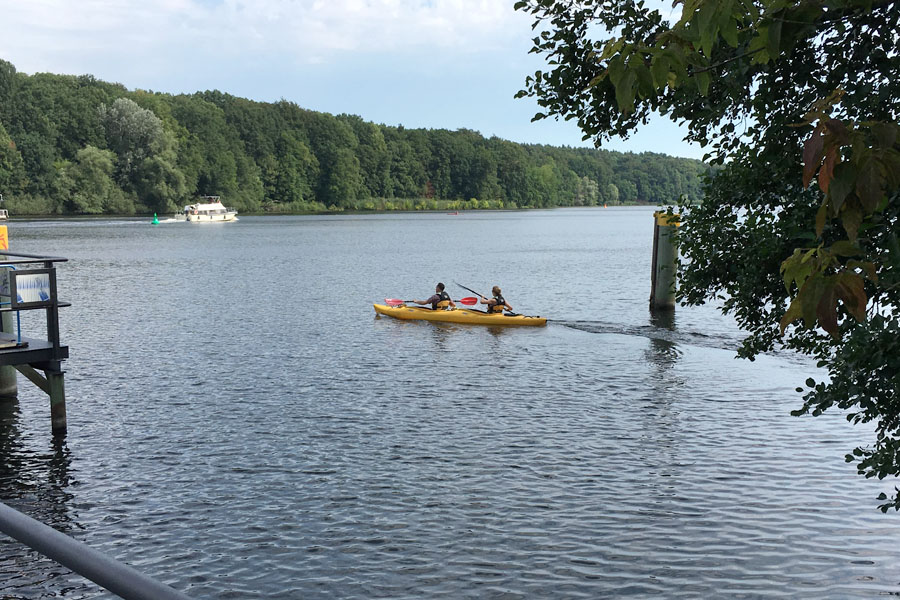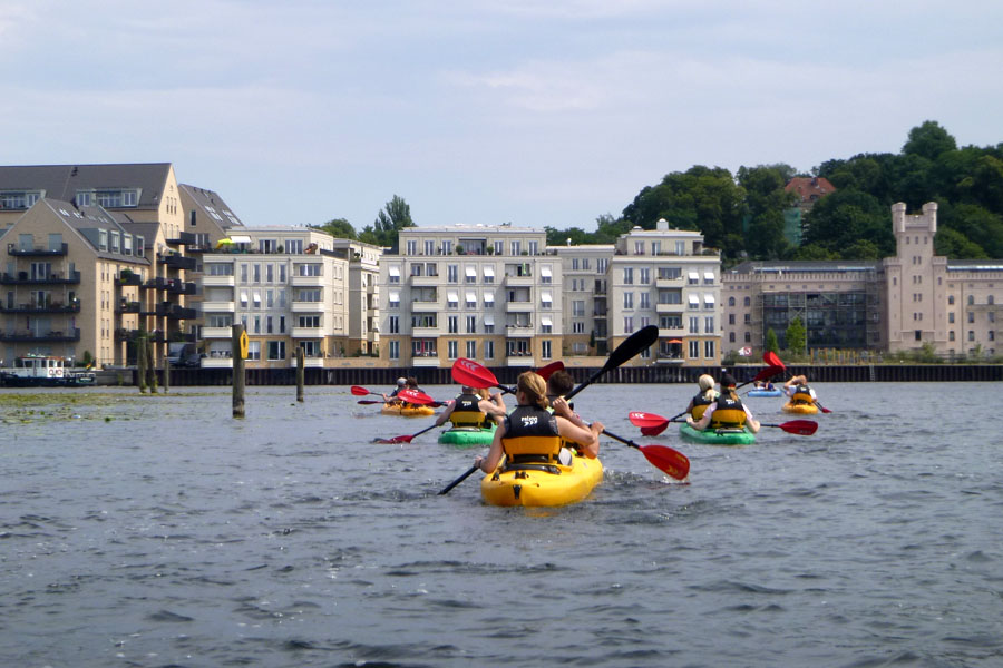 Nachdem wir in den vergangenen Jahren zu unseren Paddeltouren immer von Erkner aus gestartet waren, haben wir in diesem Jahr den Bootsverleih am Griebnitzsee als Startpunkt gewählt und uns am 21. Juli unter der Führung eines Kanuguides auf den Weg nach Potsdam gemacht. Zum Beginn gab es eine kurze Material- und Technikeinführung sowie eine kurze Beschreibung der Strecke anhand der Karte und schon wenig später waren wir mit den Booten auf dem Griebnitzsee unterwegs. So eine geführte Tour hat den Vorteil, dass man auch eine Menge über die Dinge erfährt, die man rechts und links am Ufer sehen kann - am Griebnitzsee waren das vor allem die teilweise riesigen Villen diverser Persönlichkeiten, die man überwiegend aus der Wirtschaft kennt.Schon bald konnten wir hinter der Durchfahrt zur Glienicker Brücke die Gebäude der Potsdamer Innenstadt sehen und uns an der großen Wasserfontäne vor dem Park Babelsberg abkühlen. Nach der Durchquerung der Innenstadt legten wir kurz hinter dem Lustgarten an, um eine Pause an Land zu machen. Doch die meisten von uns waren noch so motiviert, dass wir beschlossen, auch noch die Halbinsel Hermannswerder zu umrunden und zügig weiterzufahren. Diesen Entschluss bereuten am Ende des Tages zwar einige, denn dadurch paddelten wir insgesamt eine Strecke von gut 12 km. Dafür lernten wir jedoch etliche der abwechslungsreichen Gewässer in und um Potsdam kennen.Zwischendurch wurden einige Bootsbesatzung durchmischt, manche müden Seemänner mussten am Ende gezogen werden, aber alle kamen wohlbehalten und ein wenig erschöpft am S-Bahnhof Griebnitzsee an und wurden im Anschluss mit einem Restaurantbesuch belohnt.