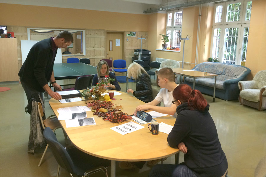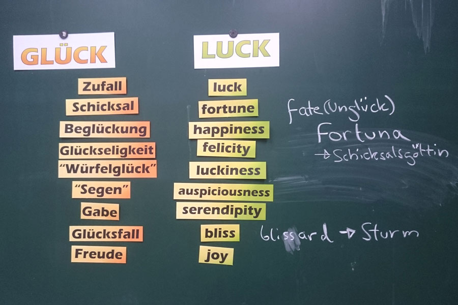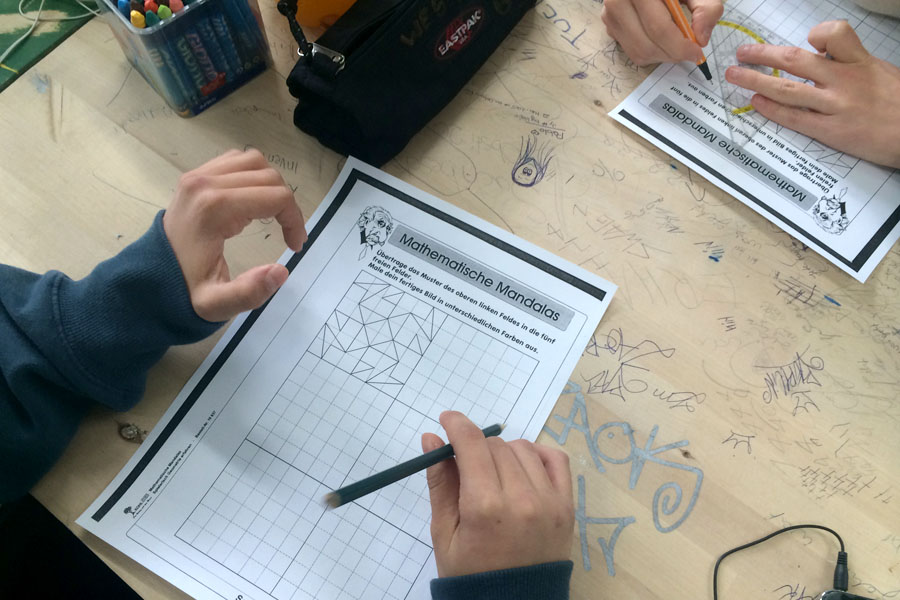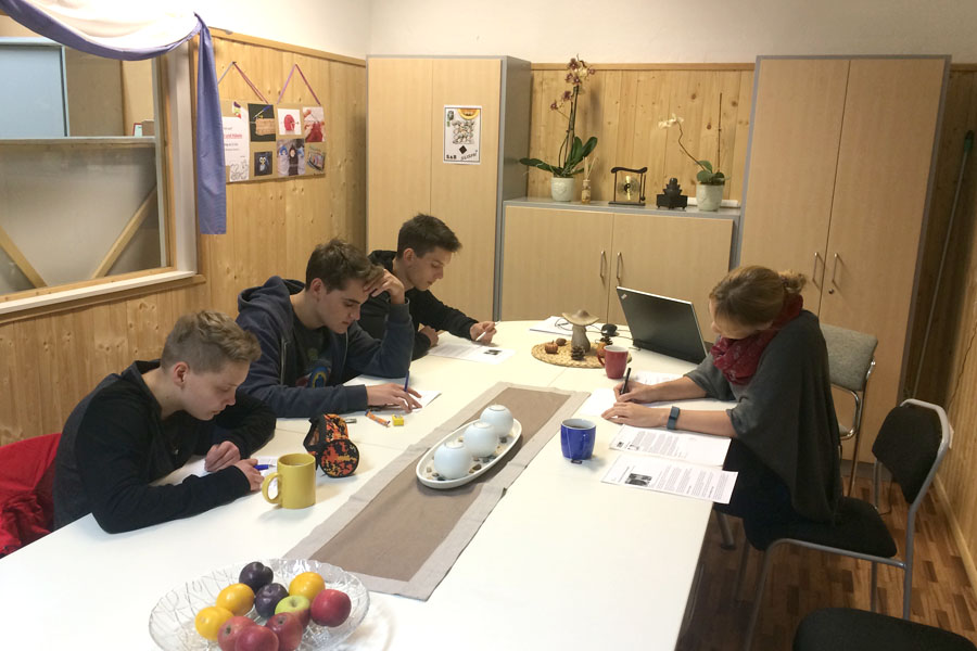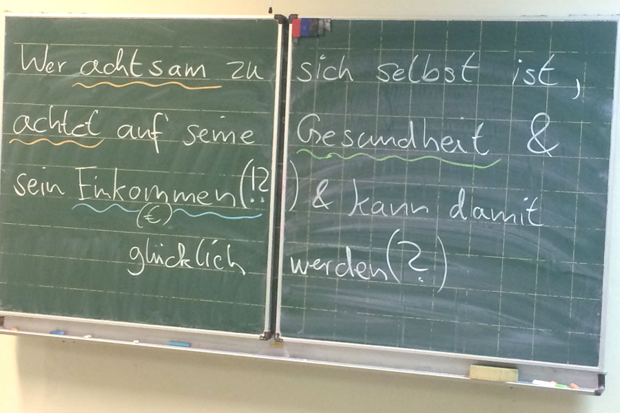 Der Projekttag widmete sich am 9. Oktober ganz dem Thema und verband theoretische Hintergründe mit praktischer Übung. Während sich die Kleingruppen zunächst dem praktischen Teil in der Remise zuwandten und unter Anleitung unseres Gastes Shanti - einem ehemaligen buddhistischen Bettelmönch - mit allen Sinnen erfahren konnten, erweiterten die TeilnehmerInnen der Lern- und Prüfungsgruppe ihren Wissensschatz an den theoretischen Stationen.Neben den mathematischen Mandalas konnte man sich auch mit den biologischen Hintergründen von Stress und Meditation auseinandersetzen oder deren chemischen Reaktionen im Körper erforschen. Die Englisch-Station hielt eine Vielzahl von Vokabeln zum Thema bereit. In welchen Ländern das Glück zum Staatsauftrag gehört bzw. in der Verfassung verankert ist, konnte man in der Erd- bzw. Sozialkundestation erfahren. Schließlich sollten die Teilnehmer auch die eigene Einstellung zum Glück anhand eines Testes evaluieren und ihren achtsamen Genuss anhand der Geschmacksampel erfahren.Nachdem die Kleingruppen den biografischen Erzählungen Shantis gelauscht und die Welt der achtsamen Übungen kennengelernt hatten, konnten auch die TeilnehmerInnen der anderen Gruppen die entspannte Atmosphäre der Remise genießen und sich ihren praktischen Übungen zuwenden.