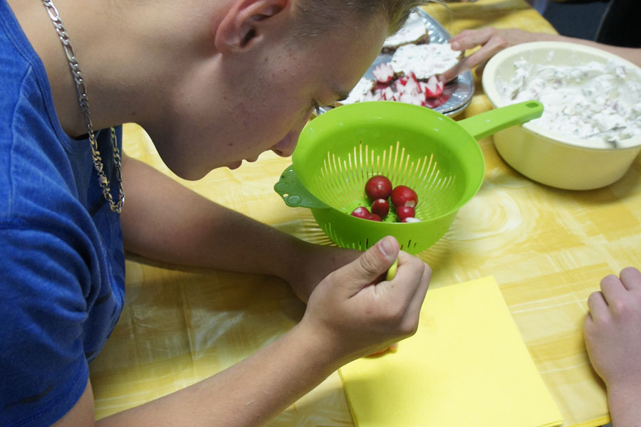 Der Projekttag am 8. Juli widmete sich dem Thema Ernährung und bot neben der theoretischen Aufarbeitung auch die praktische Umsetzung gesunder Ernährung.Der erste Teil des Tages wurde von einer Ernährungsexpertin, Frau Geßner von der AOK, geleitet, die gemeinsam mit den Jugendlichen Ernährungsgewohnheiten hinterfragte und Ernährungsmythen aufdeckte. Abgerundet durch ein gemeinsam zubereitetes Frühstück mit Obst, Gemüse, Brot und Aufstrichen waren die Teilnehmerinnen und Teilnehmer für den zweiten Teil des Tages gestärkt.