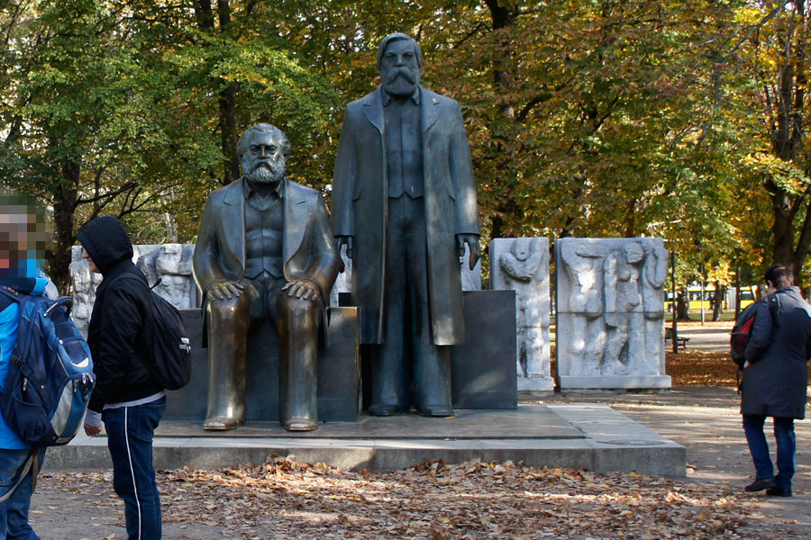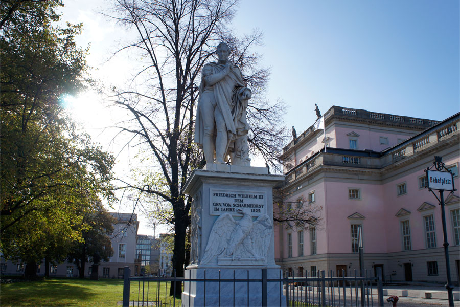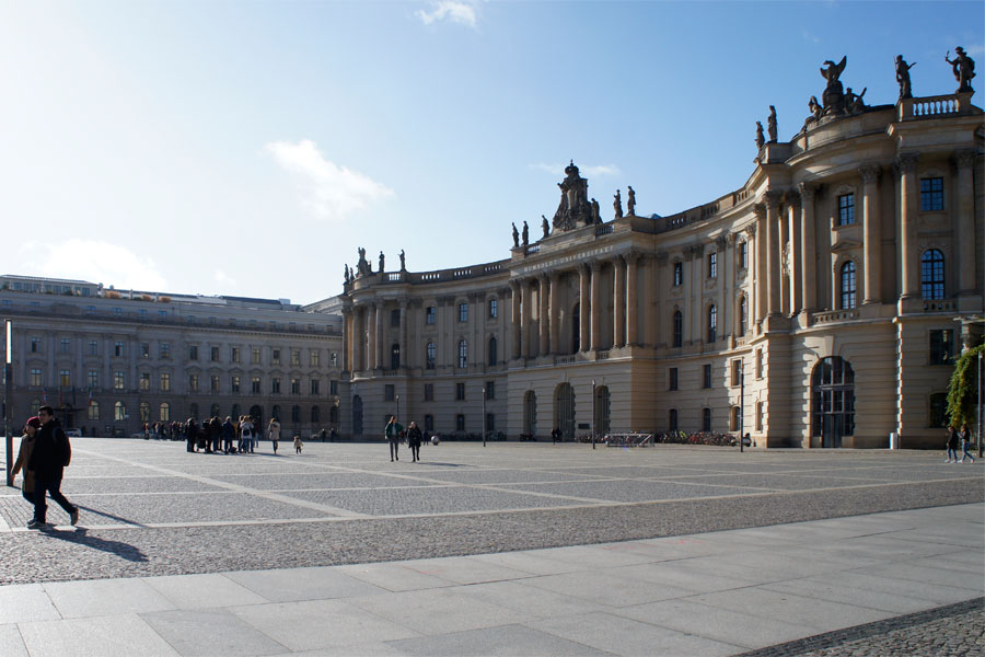 Ausgehend vom Fernsehturm am Alexanderplatz, der mit seinen 368 Metern nicht nur hoch ist, sondern auch das höchste Bauwerk in Deutschland, spazierten wir bei kühlen Temperaturen und Sonnenschein weiter zum Neptunbrunnen. Dort erfuhren wir, dass sich der Künstler von Vorbildern aus Rom inspirieren ließ. Hoch oben thront der römische Gott des Meeres, Neptun, der als Zeichen seiner Macht den Dreizack trägt. Die vier Frauengestalten symbolisieren die vier Flüsse Rhein, Weichsel, Oder und Elbe, die am Rand des Brunnens sitzen. Dieser Brunnen stand früher vor dem Berliner Stadtschloss, das abgerissen wurde und mittlerweile wieder neu aufgebaut wird. Noch steht es hinter Bauzäunen. Entlang unseres Weges kamen wir an Denkmälern vorbei, die überlebensgroß gestaltet sind, wie die bedeutenden Theoretiker des Kommunismus Karl Marx und Friedrich Engels. Auf der anderen Straßenseite war die hohe Kuppel des Deutschen Doms zu sehen. Wir schlenderten den Boulevard Unter den Linden weiter; vorbei an der Humboldt Universität, dem Alten Museum, dem Kronprinzenpalais, die uns zu einem großen Platz neben der Staatsoper führte. Auf dem Bebelplatz befindet sich ein fast unsichtbares Denkmal unter der Erde. Damit wird an die Bücherverbrennung am 10. Mai 1933 erinnert. Von nationalsozialistischen Studenten wurden dort 20.000 Bücher von Schriftstellern, Philosophen, Publizisten und Wissenschaftlern verbrannt. Leere Bücherregale in einem leeren Raum, unzugänglich und nur durch eine Glasplatte in der Pflasterung des Platzes sichtbar. Auf einmal bekommt dieser Ort eine ganz neue Bedeutung.