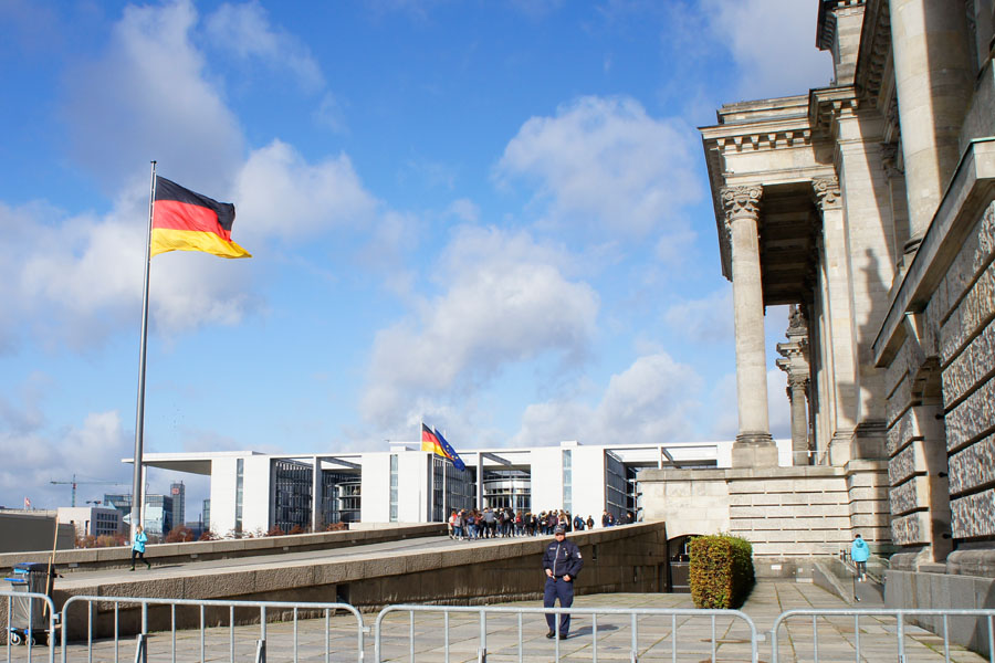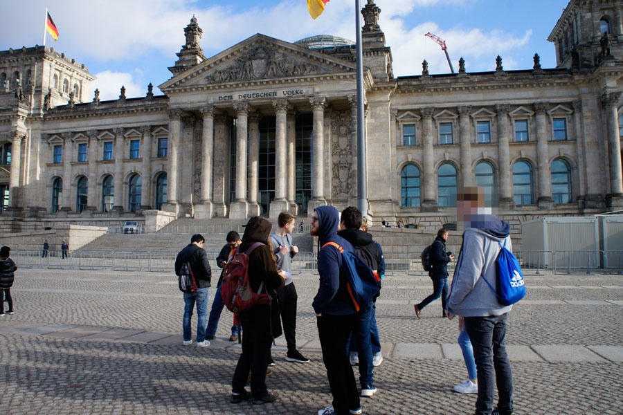 Unsere letzte bedeutende Sehenswürdigkeit erreichten wir Punkt 12:00 Uhr, als aus der Ferne die Klänge des Carillon ertönten. Das Reichstagsgebäude mit Sitz des deutschen Bundestages war allen bekannt. Auch die damit verbundene Geschichte: vom dem Ausrufen der Republik am 09.11.1918 und dem Reichstagsbrand am 27.03.1933 sind bis heute einige Jahre vergangen. Auf unserem Stadtspaziergang durch Mitte sahen wir einige Kuppeln, Denkmäler und Gebäude. Wir hörten von Zerstörung, Abriss und Wiederaufbau und bewegten uns inmitten des Neubaus und den Zeugnissen von einer sich immer veränderten Stadt(-geschichte).