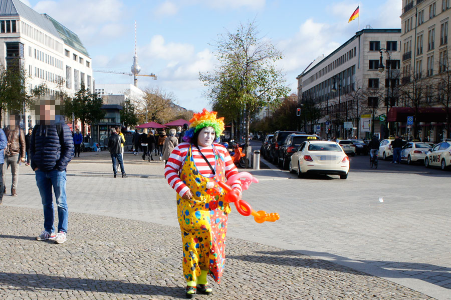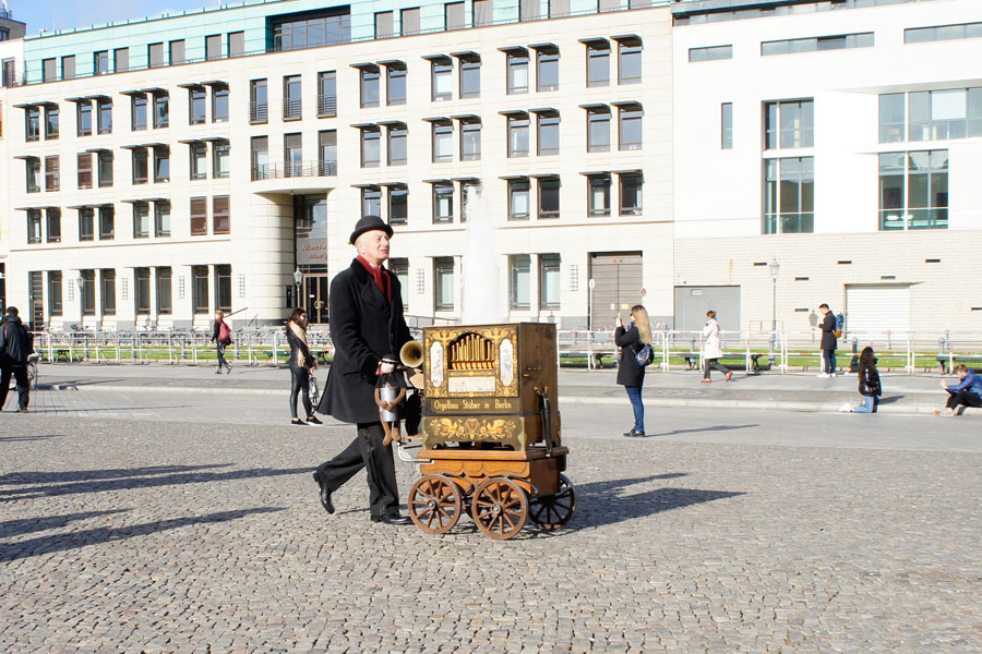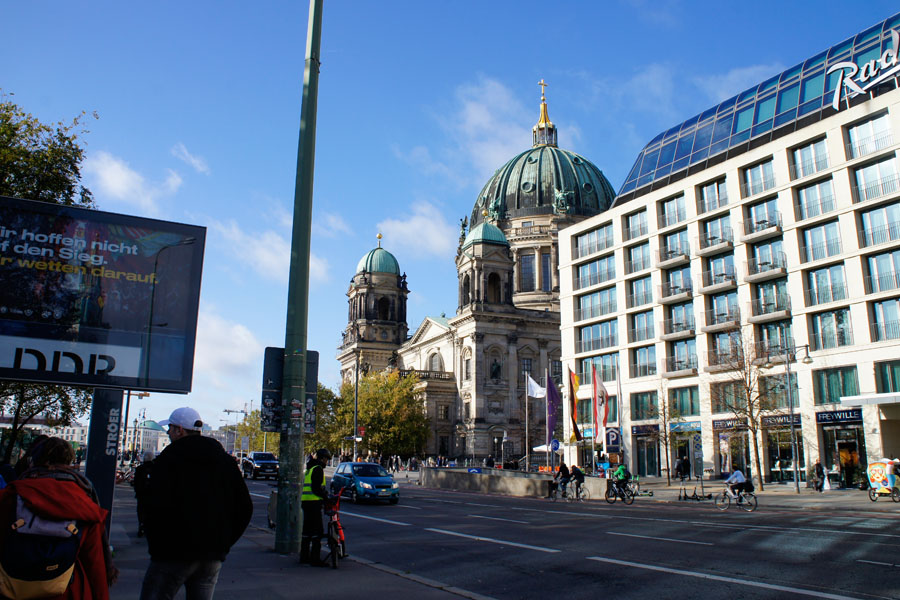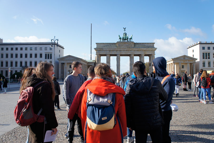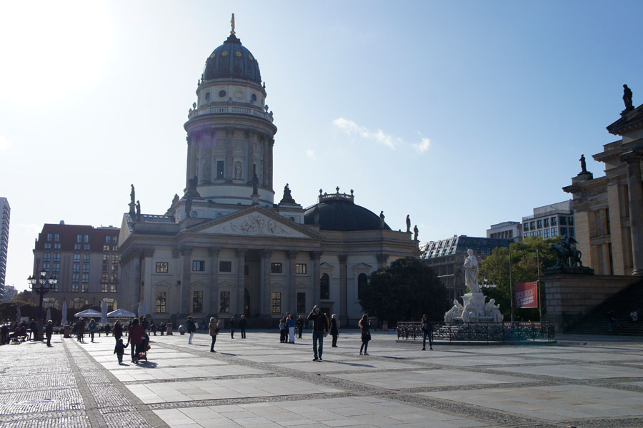 Wir machen noch einen Schlenker zum Gendarmenmarkt, auf dem sich der deutsche und französische Dom gegenüberstehen. Die Bezeichnung Dom stammt von dem französischen Wort , was „Kuppel“ bedeutet. Auf jeden Fall laden die Bänke für eine Pause an. Zurück auf der Prachtmeile Unter den Linden erfahren wir, dass die Straße als Verbindungsweg vom Stadtschloss zu den Jagdgebieten im Tiergarten genutzt wurde. Die Linden, die Bäume, die dem Boulevard ihren Namen gaben, sind gerade an der Stelle gefällt worden um die neue U-Bahn zu bauen. Wir schlängelten uns weiter durch die Touristen am Brandenburger Tor. Hoch oben thront die Quadriga. Heute ist es das einzig erhaltende Tor, von den 18 Berliner Stadttoren, die es einmal gab. Gleichzeitig ist es das Symbol der Wiedervereinigung, als die Mauer an dieser Stelle des Grenzverlaufs unter Jubel geöffnet wurde.