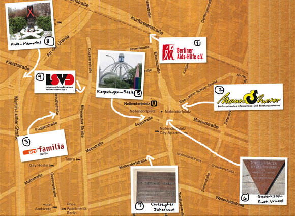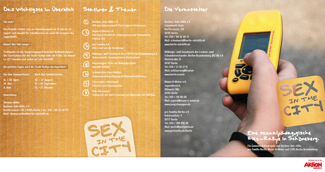 ( Geocaching-Flyer von pro familia)Vorbei am Gedenkstein Rosa Winkel, der Beratungsstelle Mann-O-Meter, der Regenbogen-Stele, den Räumen des LSVD, dem Aids-Memorial, pro familia, dem Gedenkstein Christopher Isherwood und den Räumen der Berliner Aids-Hilfe konnten die Jugendlichen nach unterschiedlicher Schwerpunktsetzung Informationen zu allen Aspekten der Sexualpädagogik anhand von kleinen Workshops und Vorträgen sowie Rätseln und Aufgaben sammeln.Persönliches Anliegen der Veranstalter und Schwerpunkt des Geocachings ist dabei die gesellschaftspolitische Komponente der Emanzipationsprozesse, Menschenrechte und Bürgerbewegungen. Ein gelungener Ausflug, der auf jeden Fall wiederholt wird!
