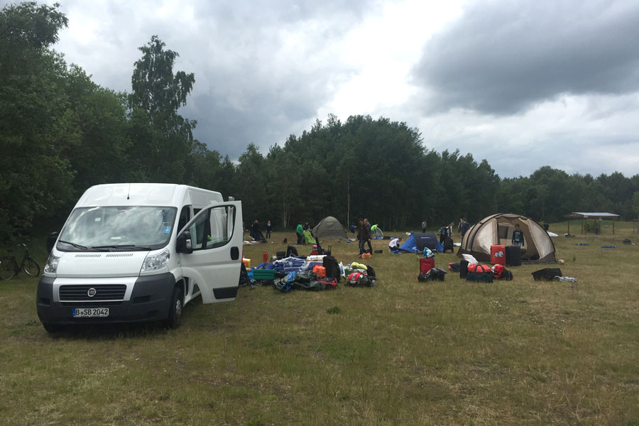 Schnell war die Woche auf Rügen vergangen und die Zelte wurden morgens (bei schönstem Sonnenschein und sommerlichen Tempearturen) wieder abgebaut, alles verpackt und gegen 11 Uhr kam dann der Bus, der uns zurück nach Berlin brachte. Dabei konnten wir kurz nach der Abfahrt noch den Rasenden Roland sehen, eine alte Dampflokomotive mit historischen Wagen, die auf der Insel zwischen Putbus und Göhren fährt.