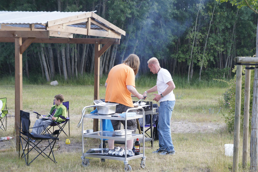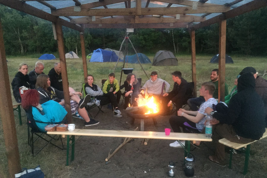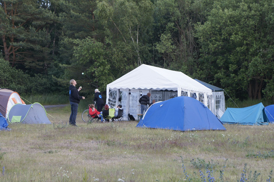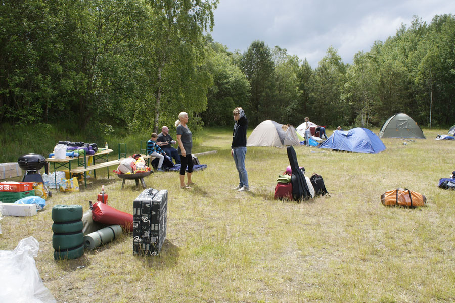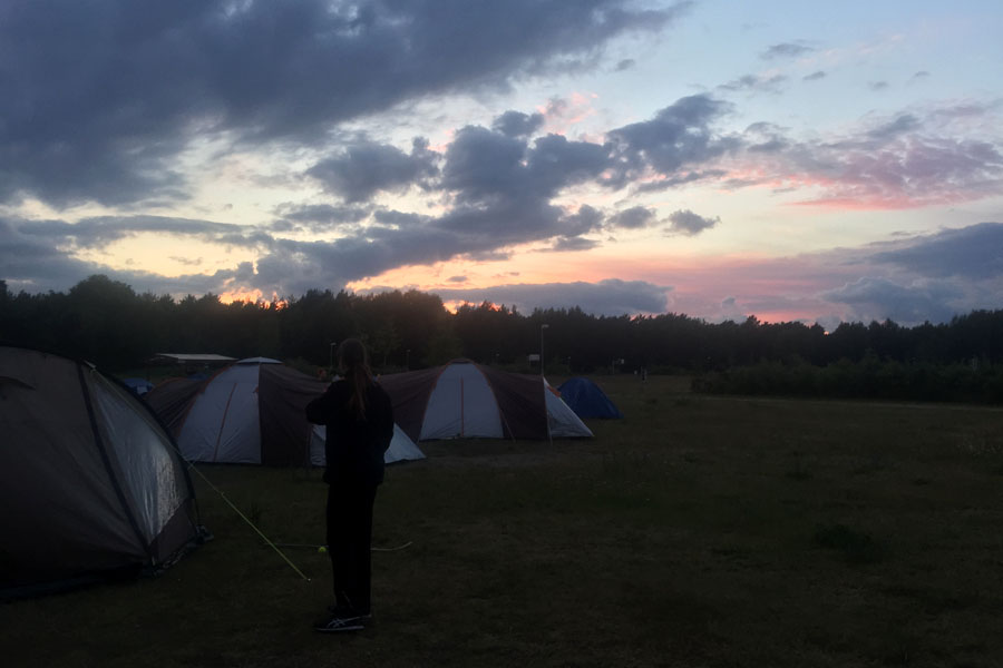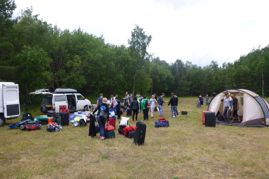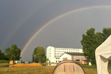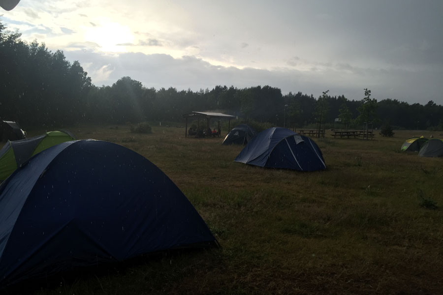 Am Montag, an unserem Ankunftstag, haben wir erstmal alles ausgepackt und die Zelte aufgebaut. Bei dem großen Pavillon fehlte allerdings eine Stange, für die Micha aber schnell aus einem passend zurechtgesägtem Ast Ersatz schnitzte. Im Laufe des Nachmittags gab es einen kräftigen Regen, der einige Zelte durchnässte. Bevor er richtig aufgehört hatte, schien schon wieder die Sonne und wir konnten einen tollen Regenbogen beobachten.Zum Glück waren ausreichend Reservezelte vorhanden, die anschließend aufgebaut wurden. So hatten abends alle wieder ein trockenes Zelt und die meisten nass gewordene Sachen konnten wir in der Jugendherberge in einem Trockner trocknen. Um 19 Uhr gab es in der Jugendherberge Abendessen. Anschließend haben wir noch ein Lagerfeuer in der großen Feuerschale gemacht und sind später alle müde in unsere Schlafsäcke gekrabbelt.