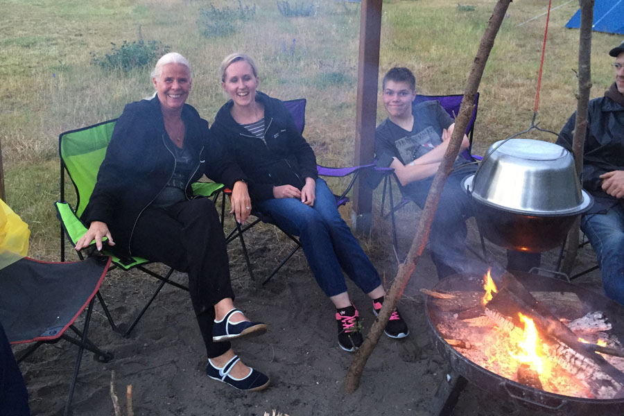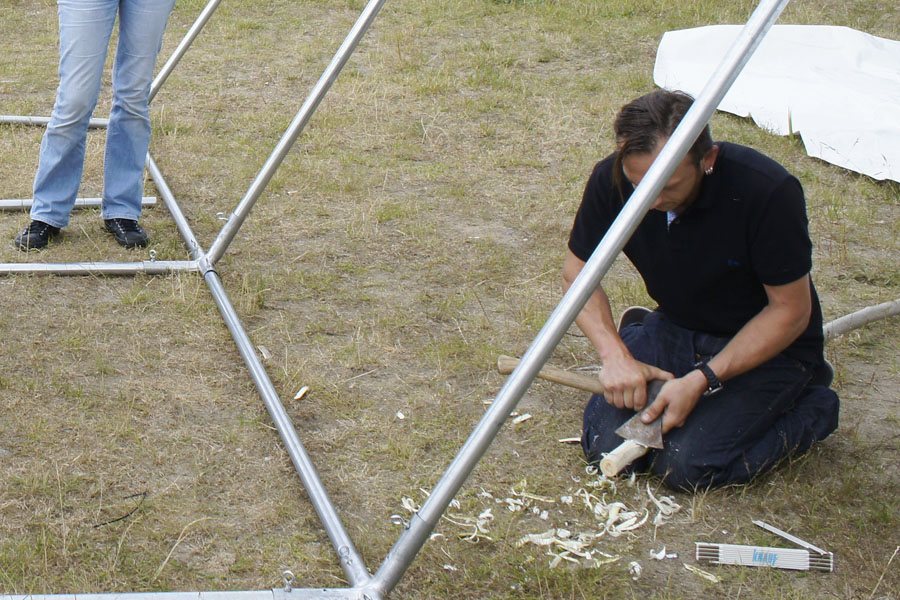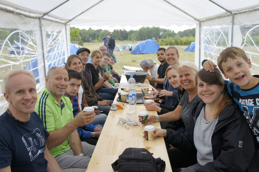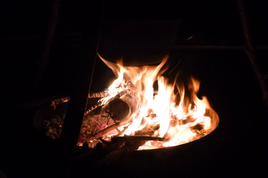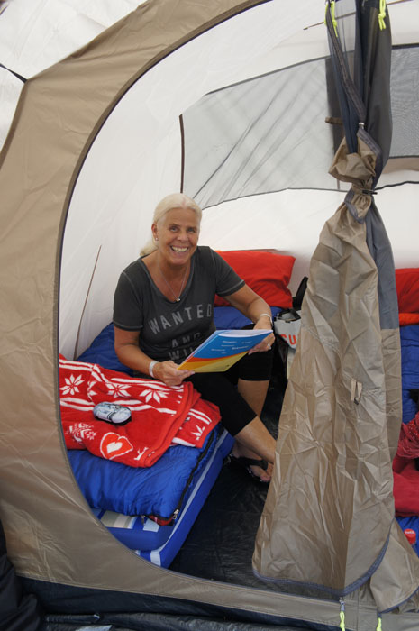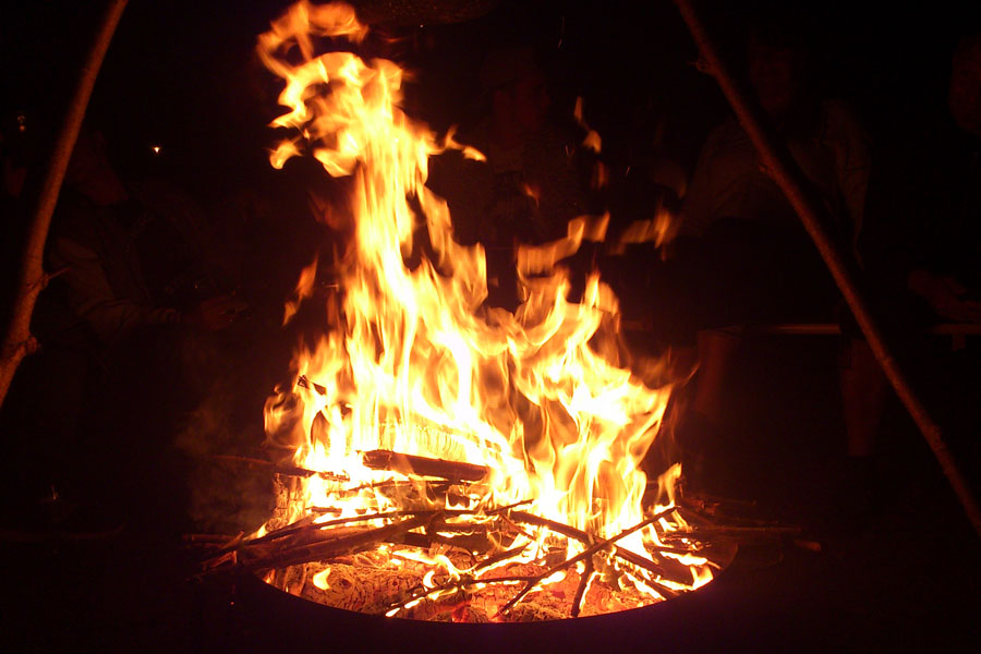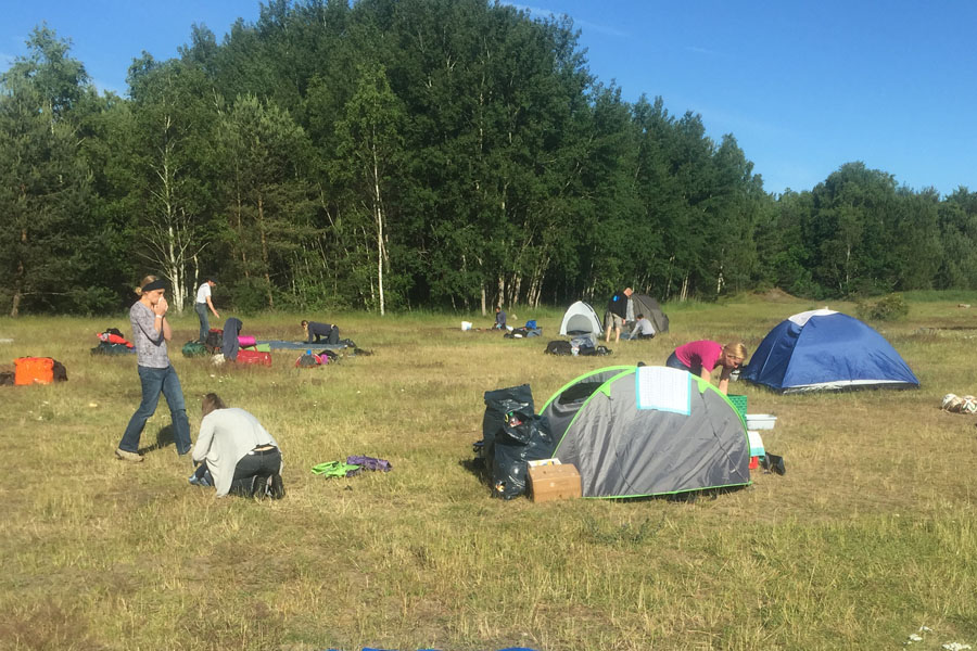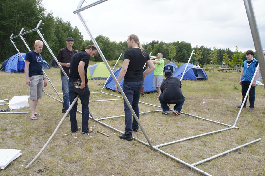 Am Montag, an unserem Ankunftstag, haben wir erstmal alles ausgepackt und die Zelte aufgebaut. Bei dem großen Pavillon fehlte allerdings eine Stange, für die Micha aber schnell aus einem passend zurechtgesägtem Ast Ersatz schnitzte. Im Laufe des Nachmittags gab es einen kräftigen Regen, der einige Zelte durchnässte. Bevor er richtig aufgehört hatte, schien schon wieder die Sonne und wir konnten einen tollen Regenbogen beobachten.Zum Glück waren ausreichend Reservezelte vorhanden, die anschließend aufgebaut wurden. So hatten abends alle wieder ein trockenes Zelt und die meisten nass gewordene Sachen konnten wir in der Jugendherberge in einem Trockner trocknen. Um 19 Uhr gab es in der Jugendherberge Abendessen. Anschließend haben wir noch ein Lagerfeuer in der großen Feuerschale gemacht und sind später alle müde in unsere Schlafsäcke gekrabbelt.