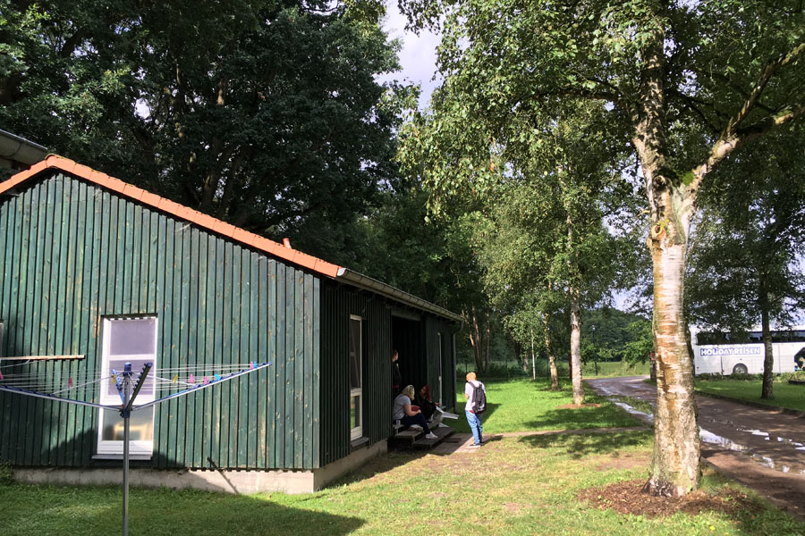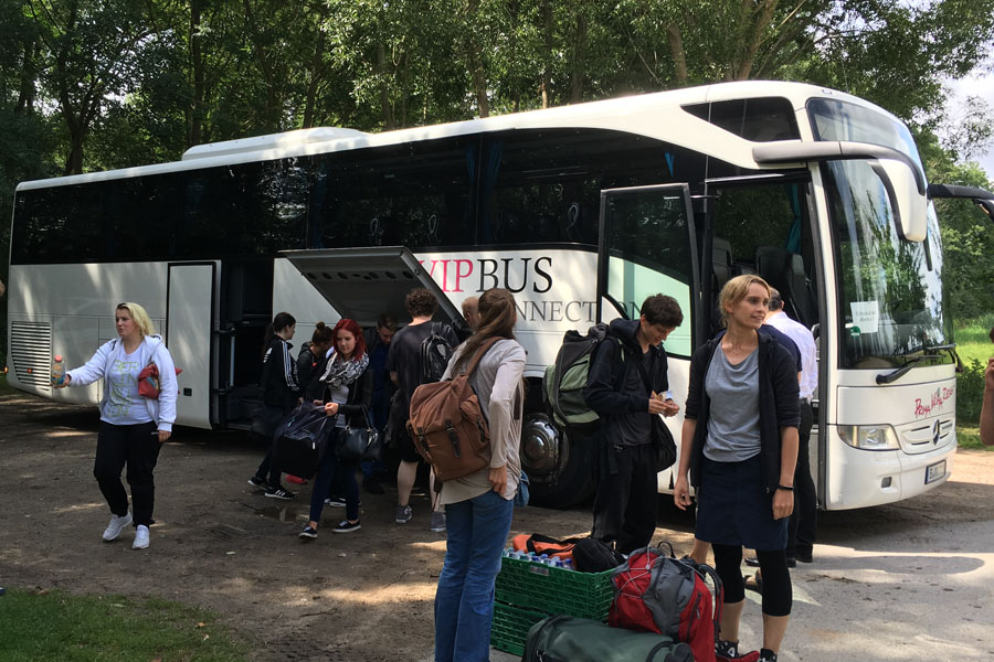 Montagmorgen, 1. August: gegen 8:30 Uhr trafen wir uns im Projekt. Alle kamen relativ pünktlich. Als der Bus eintraf, eilten viele daraufhin zum Bus, packten ihre Taschen unten in den Kofferraum und suchten sich einen Platz. Kurz darauf fuhren wir auch schon los. Petra, Jenni und Robert waren währenddessen bereits auf dem Weg zur Jugendherberge Zielow, damit sie vor Ort alles klären und vorbereiten konnten. Zielow am südlichen Ende der Müritz war unser Ziel und nach guten zwei Stunden erreichten wir es dann auch. Petra, Jenni und Robert nahmen uns dort in Empfang. Wir hatten zwei Bungalows etwas abseits der Jugendherberge für uns alleine, direkt neben dem Volleyballfeld, der Tischtennisplatte und den Basketballkörben.