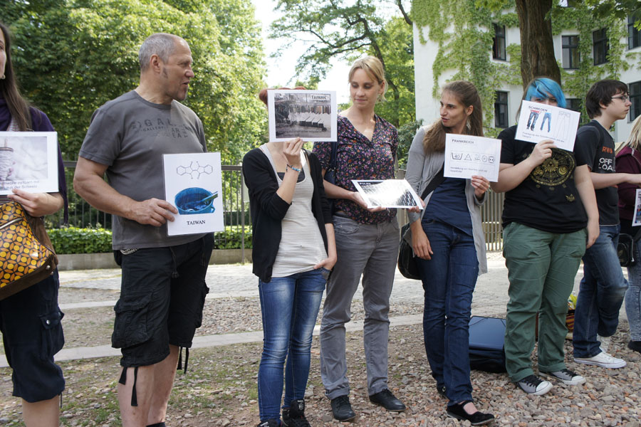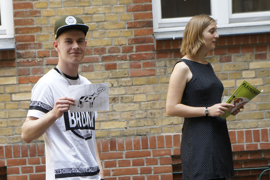 Am Freitag, dem 12.6.15 begaben wir uns mit zwei Vertreterinnen der BUND-Jugend auf einen Stadtspaziergang mit dem Titel „WELTbewusst“. Treffpunkt: Hackescher Markt.Gleich am Anfang sprachen wir über Kosmetik. Viele Produkte enthalten Stoffe, die wir nicht kennen. (Was für Wörter allen auf einer Handcremetube zu lesen waren!)Dann beschäftigten uns mit Themen wie Import und Export, Herstellungsprozessen und Verarbeitung von Waren in der globalisierten Welt. Eine einzige Jeans wird zum Beispiel in China, Indien, Niederlande, Polen, Türkei, Taiwan, Pakistan, Frankreich und Italien gefertigt!Mit Bananen ist es zum Teil so ähnlich wie mit den Jeans. Sie werden von Arbeitern angebaut, die schlecht bezahlt werden und keine Gewerkschaft gründen dürfen. Am meisten verdienen an den verkauften Bananen die Supermärkte, zum Beispiel Aldi. All das konnten wir in einer Gruppenarbeit mit verteilten Rollen herausfinden.Ein weiteres Thema war Fleisch. Wir besprachen an einem Beispiel die Herstellung und die Folgen davon: Die Kuh Bonita (unser Beispiel) wird mit Soja gefüttert - für den Soja-Anbau wird der Regenwald abgeholzt. Außerdem werden die Sojapflanzen mit giftigen Pestiziden gespritzt. Dazu bekommt Bonita regelmäßig Antibiotika verabreicht - wir nehmen diese Antibiotika auf, wenn wir Bonitas Fleisch essen, dadurch werden Bakterien resistent gegen Antibiotika. Das heißt, dass wir, wenn wir krank sind, kein wirksames Mittel mehr gegen bestimmte Bakterien haben. Bonita schadet auch dem Klima: Sie scheidet Methangas aus (wenn sie pupst), was zur Folge hat, dass die Sonnenstrahlen zurück auf die Erde reflektiert werden. Dadurch wird die Erde erwärmt.Während der Diskussionen an verschiedenen Orten und rund um den Hackeschen Markt haben wir auch ein paar Spatzen gefüttert. Der ganze Spaziergang war sehr informativ, und die Leiterin des Spaziergangs hielt uns mit kreativen Ideen bei Laune.
