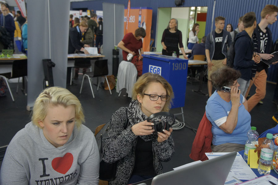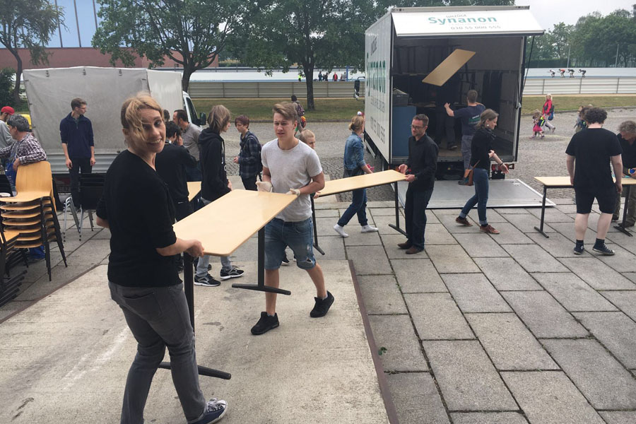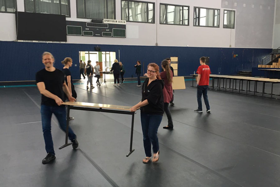 Wie bereits in den letzten Jahren waren wir wieder für die bevorstehende Berufsorientierungsmesse 9. Ausbildungstag der Ausbildungsoffensive Pankow am 25.5.2016 im Sportforum Hohenschönhausen sowohl als Aufbau- und Abbauteam der Messestände und als BesucherInnen/TeilnehmerInnen aktiv beteiligt. Einen Tag vor Messebeginn trafen wir uns bereits um 7:45 Uhr und in kürzester Zeit hatten wir das bereitstehende Mobiliar für die Einzelvorträge in die Nebenräume der Halle an Ort und Stelle platziert.Nun hieß es warten, weil zunächst die Messehalle von einer Firma mit einem besonderen Bodenbelag verlegt werden musste. Auch warteten wir auf weitere Tische und Stühle, die mit dem LKW von Synanon geliefert wurden, um die Messehalle für die 60 Austeller einrichten zu können. Das Warten verbrachten wir mit Gesprächen und Erkundigungen des Sportforums. Nachdem der Bodenbelag verlegt und die Stühle und Tische angeliefert waren, räumten wir mit gemeinsamen Kräften zügig die Haupthalle für die morgige Messe fachmännisch ein.Am 26.5. war der 9. Ausbildungstag sehr gut besucht. Wie bereits im letzten Jahr erkundeten wir in kleinen Gruppen die diversen Stände der Ausbildungsbetriebe und -einrichtungen. Einige TeilnehmerInnen trugen sich auf eine Liste für einen Praktikumsplatz für die Altenpflege ein. Wir sammelten Infomaterialien oder nahmen an Vorträgen, z.B. für den Polizeiberuf teil.Einen Tag nach der Berufsmesse konnten wir wegen der zahlreich erschienenen TeilnehmerInnen zügig das Mobiliar wieder abbauen.