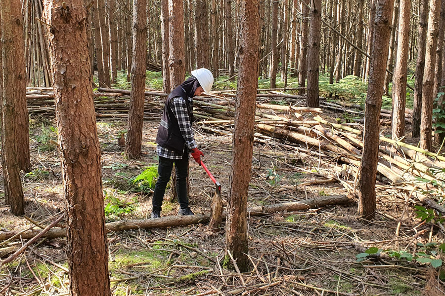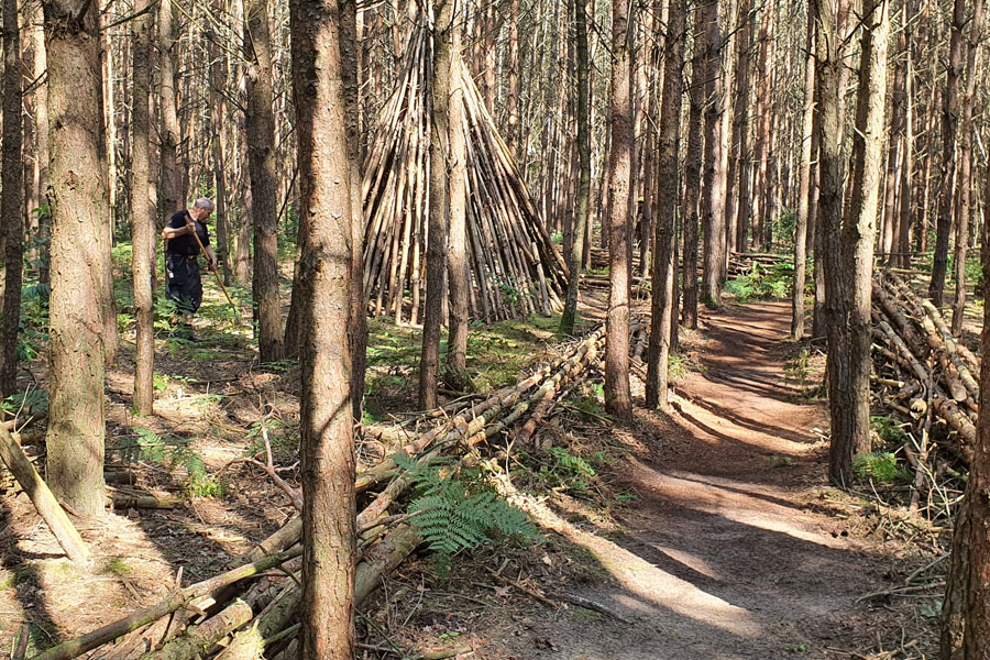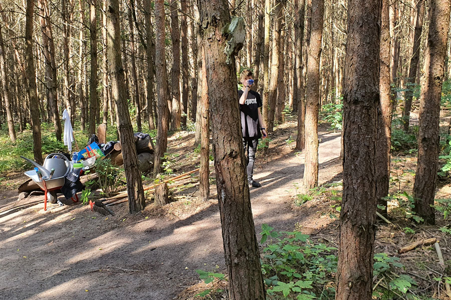 Unser wöchentlicher Ausflug in den Wald fing mit der Auswahl der richtigen Werkzeuge für die geplanten Arbeiten an, die wir in den Transporter luden.Dann ging es los zur Ortschaft Oberkrämer in Brandenburg. Nach der Ankunft im Wald machten wir eine kurze Pause von der langen Fahrt. Als die Pause vorbei war, nahmen wir die Werkzeuge, Versorgung und Helme und machten uns an die Arbeit. An der Stelle, wo wir unsere Ausrüstung ablegten, gab es eine kurze Arbeitseinweisung. Nach der Einweisung haben wir die toten Bäume gefällt und das Totholz auf der Benjeshecke aufgestapelt.Zwischendurch haben wir unsere Wassertonne, den Unterstand und das Holz-Tipi inspiziert und gewartet. Weil Bewegung an der frischen Luft hungrig macht, haben wir uns gestärkt mit dem Proviant, das Bianca für uns vorbereitet hat. Auf der Fahrt zurück waren wir erschöpft von der Bewegung an der frischen Luft.