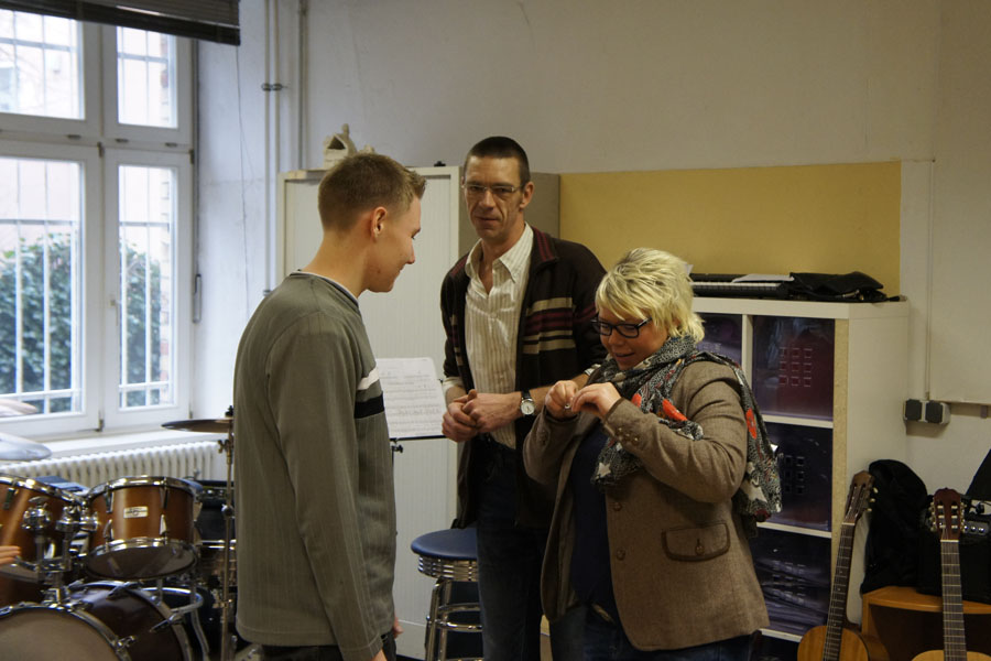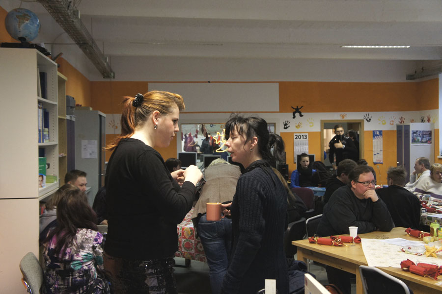 Am vergangenen Mittwoch fand die Projektweihnachtsfeier bei Schule & Beruf statt. Nach einer kurzen Begrüßung aller Anwesenden begann Jenni mit einem Jahresrückblick, in dem an die wichtigsten Ereignisse und erreichten Ziele dieses Jahres erinnerte wurde. Eine Auswahl von Fotos als Hintergrund der Präsentation ließen die Erinnerungen an viele schöne und interessante gemeinsame Stunden wieder wach werden.Dann folgte mit der Zeugnisausgabe für die Absolventen der Herbstprüfungen der nächste wichtige Tagesordnungspunkt. Neben den Zeugnissen gab es für die erfolgreichen Teilnehmerinnen und Teilnehmer wie immer das Schule & Beruf-T-Shirt sowie - passend zur Jahreszeit - einen Schokoladenweihnachtsmann, überreicht durch Numcy und Markus.Neu zum Abschluss dieses Jahres waren verschiedene Auszeichnungen, die einigen Teilnehmerinnen und Teilnehmern durch Nancy und Steffen verliehen wurden wie z.B. den Projektengel für Hilfsbereitschaft, als Kämpferin des Jahres oder als Aufsteigerin des Jahres.Traditionell folgte nach diesem ersten formellen Teil das gemeinsame Weihnachtsessen. Es war unglaublich lecker: Gänse- und Putenbraten mit Rotkohl und Klößen und zum Nachtisch selbstgemachte Rote Grütze.Am Nachmittag wurde dann noch gemeinsam Musik gemacht und gesungen, Tischtennis und Kicker gespielt und zwischendurch natürlich auch das eine oder andere Stück Kuchen, Stollen und Weihnachtsgebäck verdrückt. Alles in allem war es wieder ein ereignisreicher und lustiger Tag.Fotos von der Weihnachtsfeier: